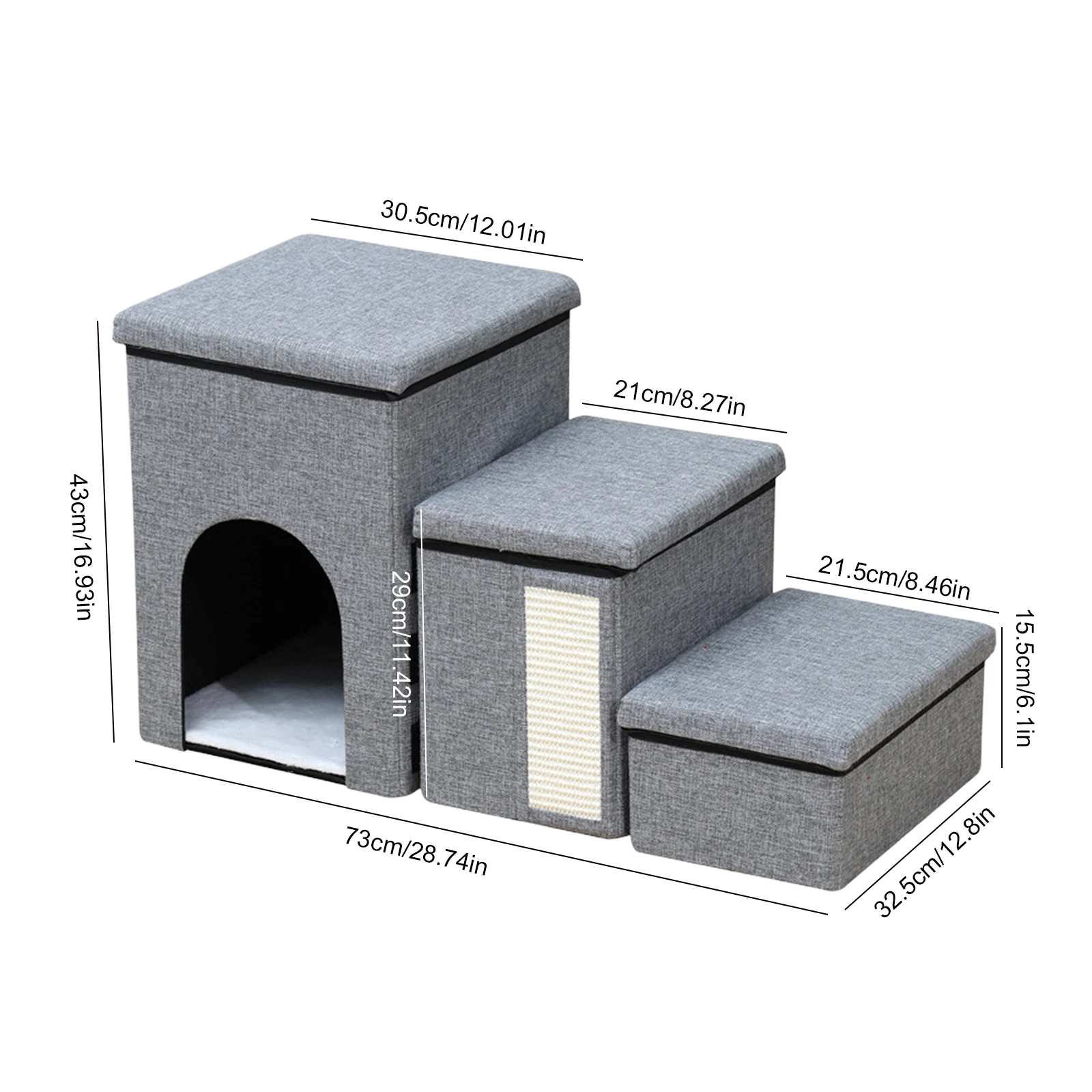 1.Versatile Storage Solution: This pet climbing ladder integrates a foldable pet stairs, multifunctional cat bed, pet stairway storage box and removable storage organizer in one. The first two steps double as storage bins for toys, food, clothes, or accessories, while the third makes a cozy apartment for cats or puppies, and a scratching board for your