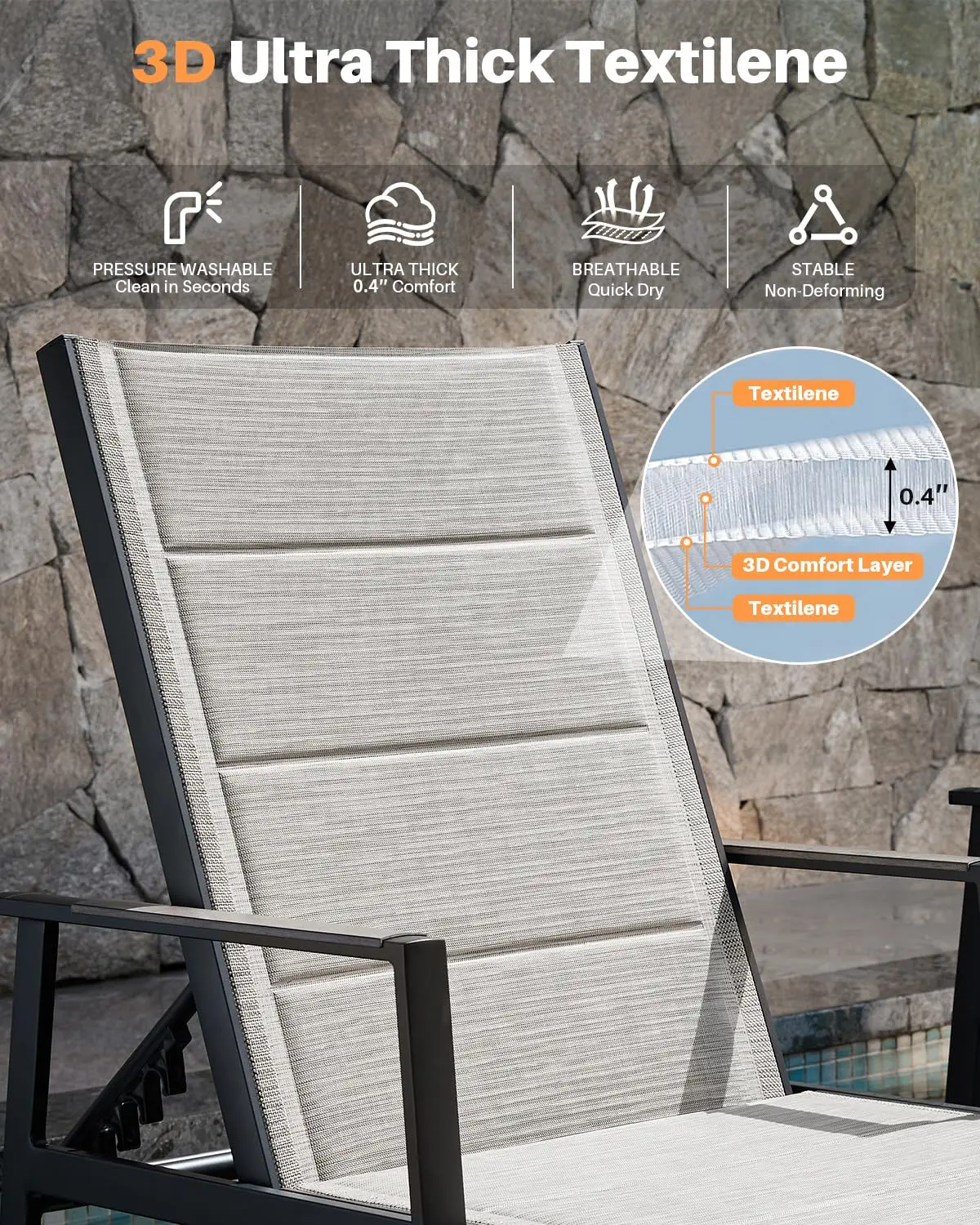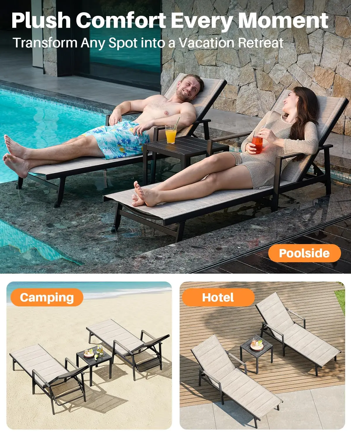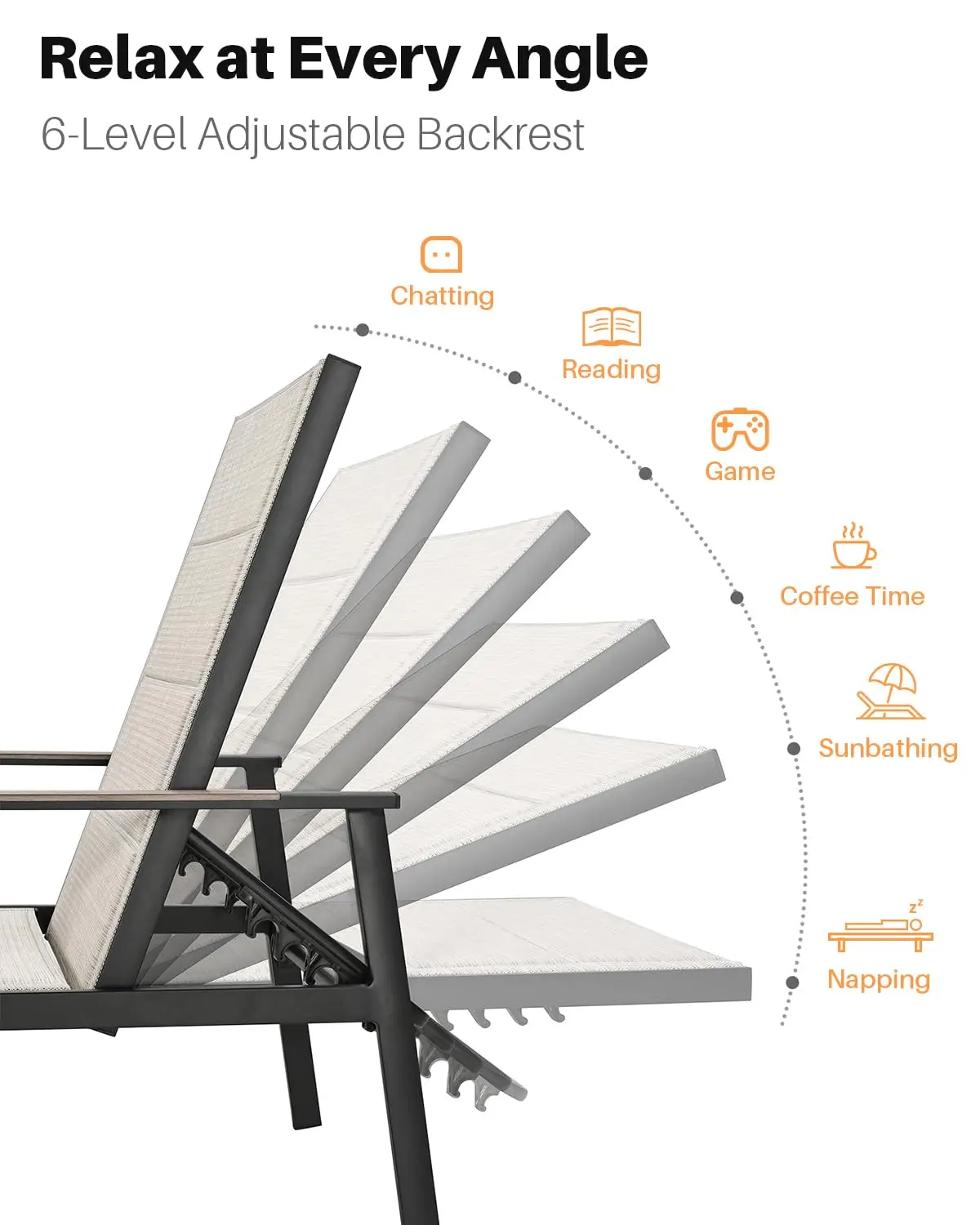 6-LEVEL ADJUSTABLE BACKREST: Each chaise lounge offers six reclining positions to suit sunbathing, reading, or napping. Hand-brushed armrests with a natural wood-look texture provide ergonomic support and refined detail, enhancing the high-end look of your outdoor space.
