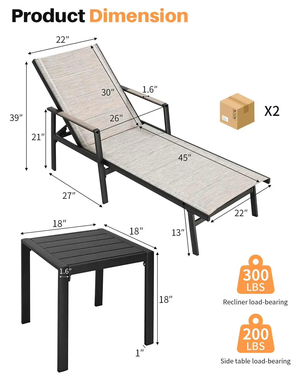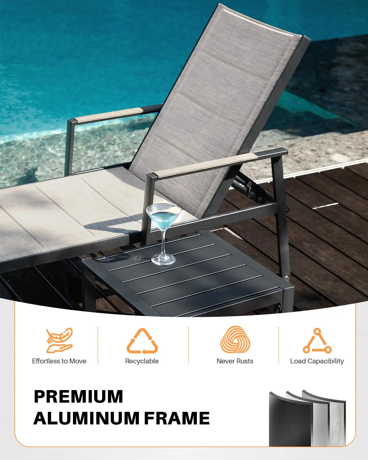 NEVER-RUST ALUMINUM FRAME: Crafted from premium aluminum that never rusts, this set of two pool lounge chairs and a side table ensures long-term stability and reliable support. The environmentally friendly powder-coated finish protects against scratches, maintains a polished, fade-resistant look, and the fully recyclable frame offers sustainable, high-quality outdoor furniture.