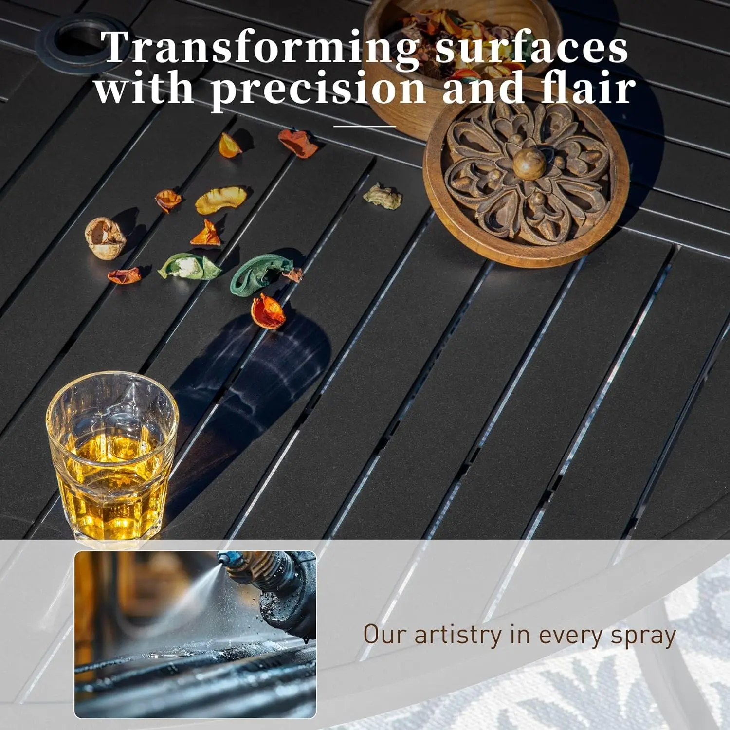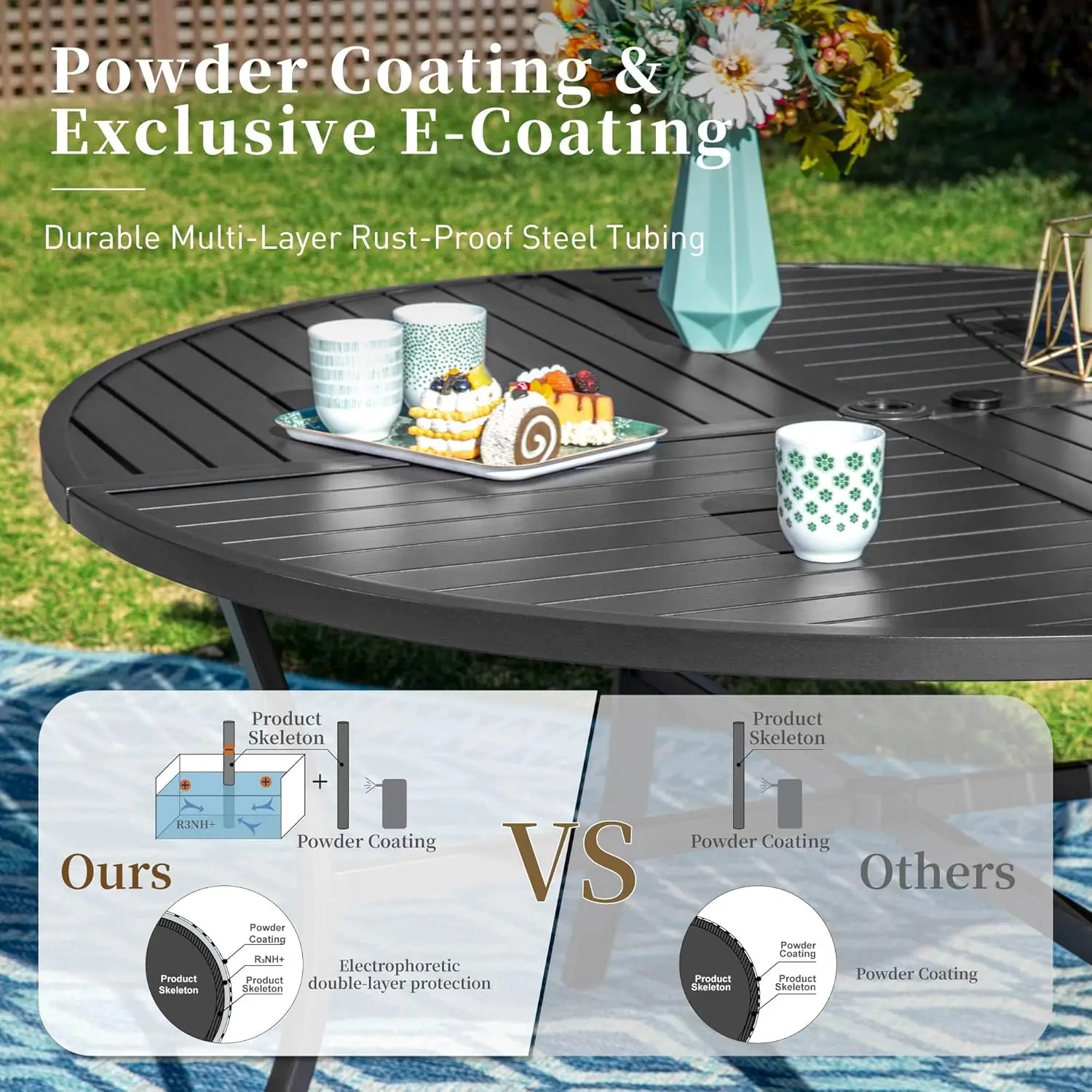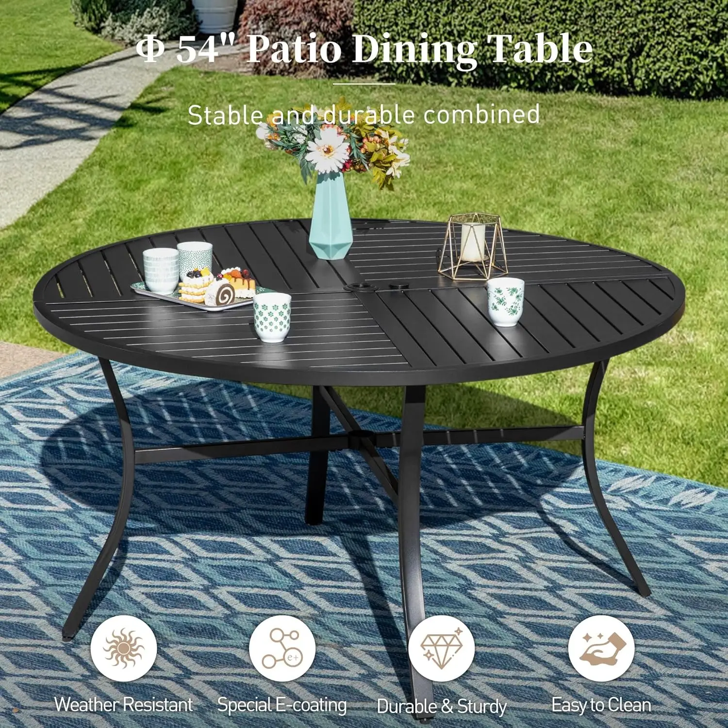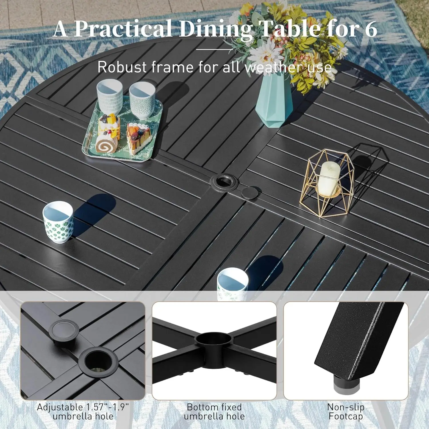 Metal Tabletop with Umbrella Hole:The dining table is designed with an umbrella hole (umbrella not included), and the 1.57″ diameter hole is suitable for most terrace sunshades, making it convenient for shading outdoors and enhancing your leisure experience in gardens, lawns, terraces, or poolsides