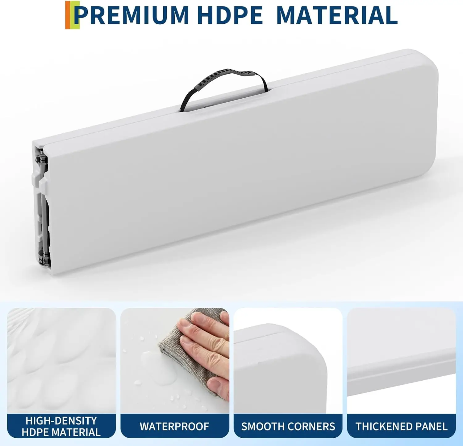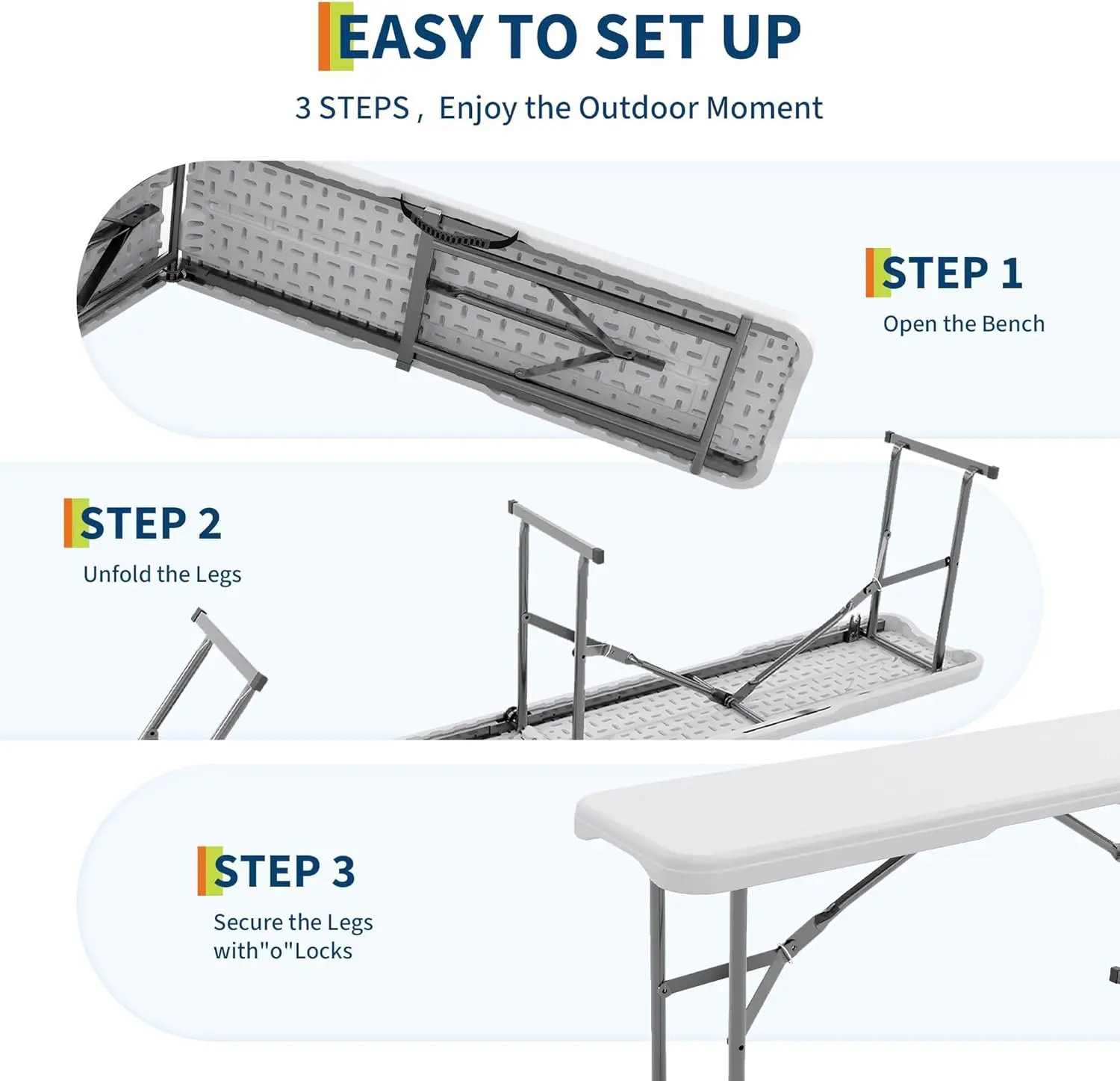 【Durable HDPE Material】– Made of high-density polyethylene, this plastic folding bench is weather-resistant and built to withstand sun, rain, and snow without cracking or fading, supports up to 380 LBS. It's easy to clean with just a damp cloth.