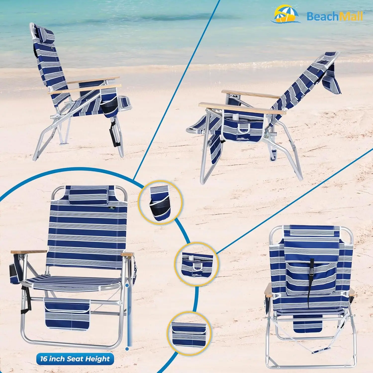 WEIGHS 15 lbs & STURDY – Beach chair reclines in 4 positions ; Anodized Aluminum with reinforced steel inside for extended durability and rust resistance
