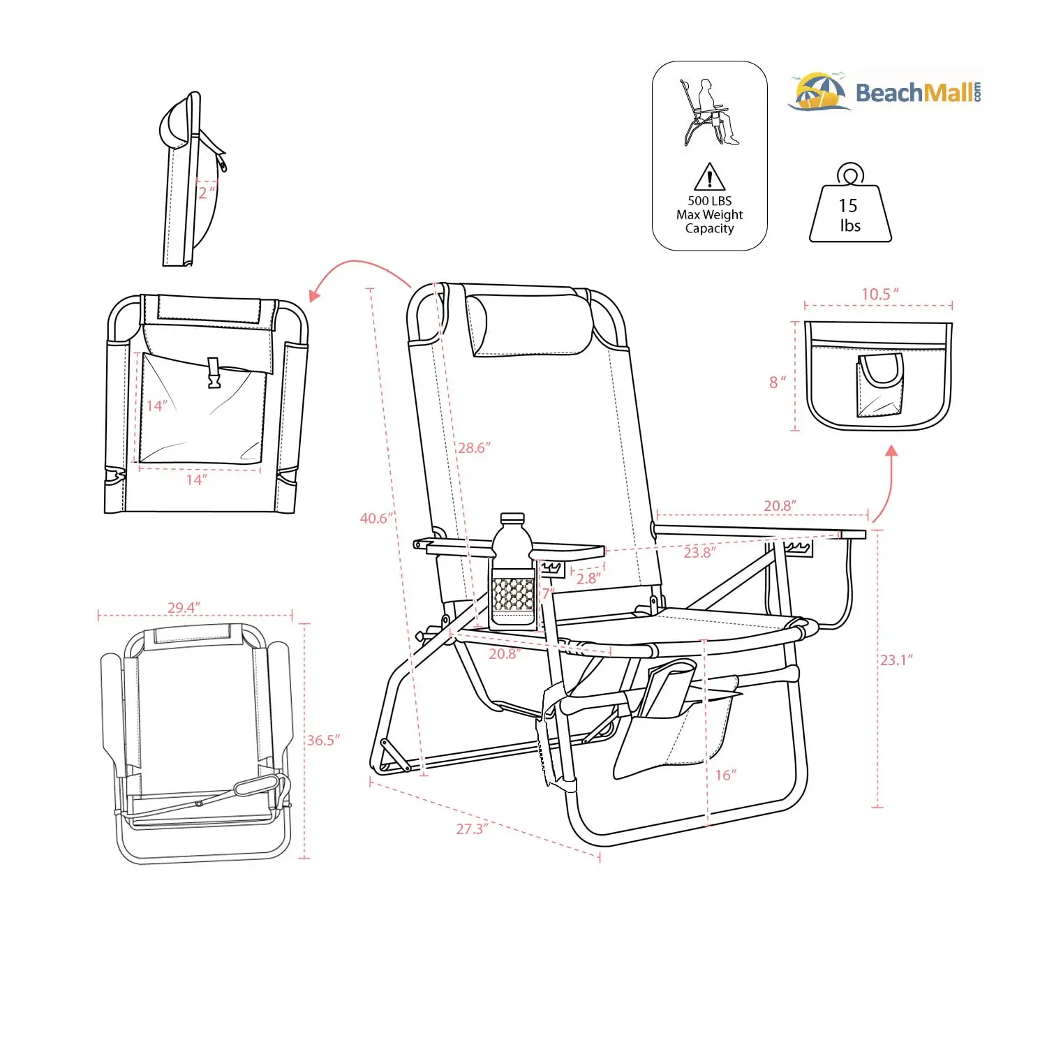 HOLDS upto 500 lbs. Mesh drink holder and large rear-access carry pouch with buckle on back and additional Zippered storage pouch on the armrest and under seat