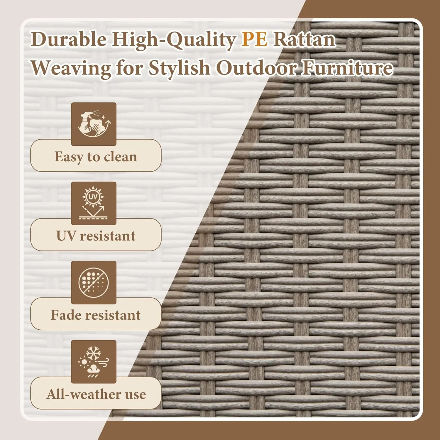 PE wicker design: Made with durable PE material, this wicker design is UV-resistant, weatherproof, and easy to clean, providing long-lasting beauty and functionality for both indoor and outdoor use.