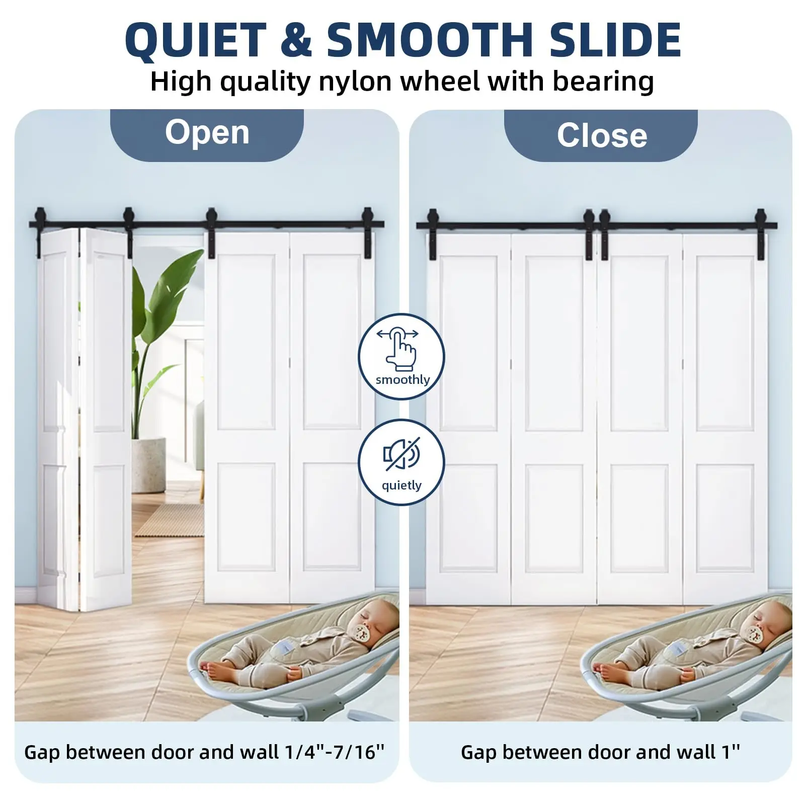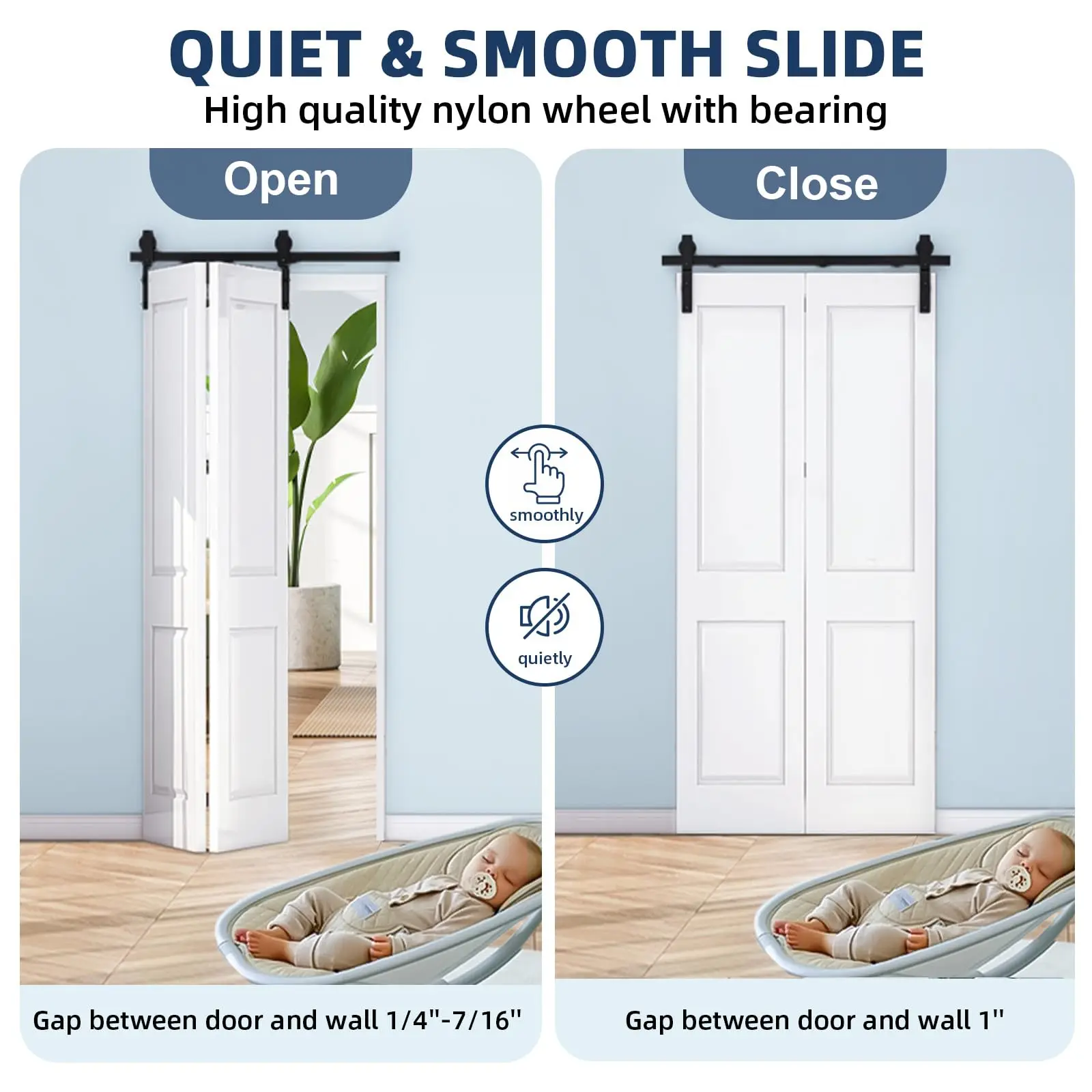 3. Space-Saving Solution: The bi-fold mechanism allows doors to fold neatly against the wall, maximizing room in apartments, closets, pantries, laundry rooms, and more. Minimal opening and closing clearances (1/4''–7/16'' open, 1'' closed) further optimize compact spaces.