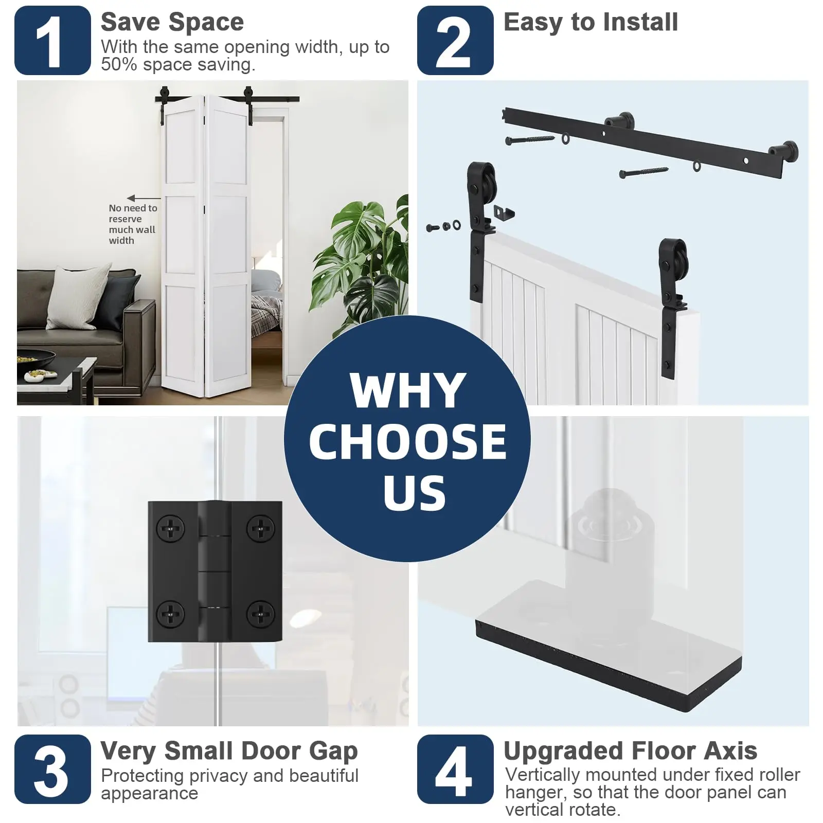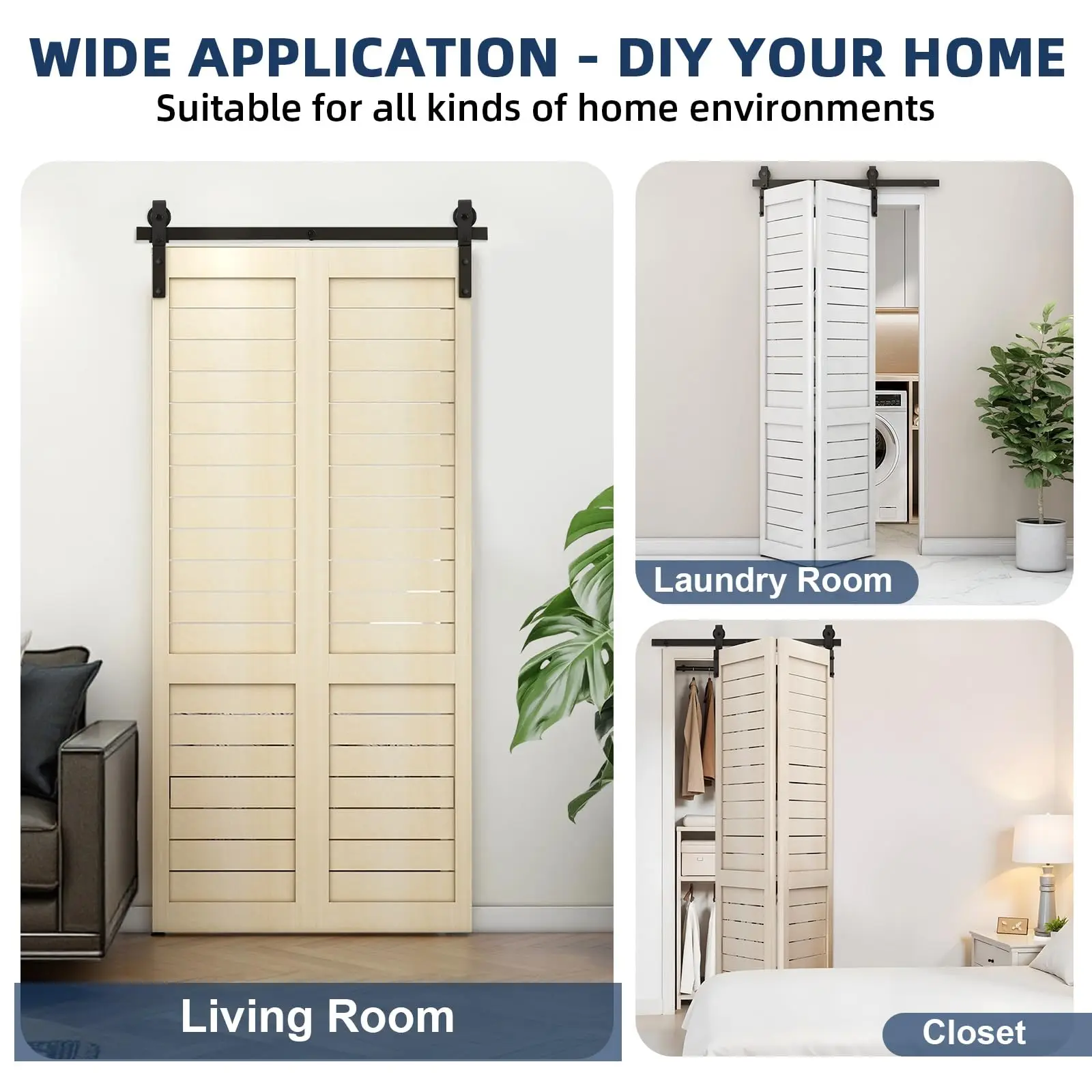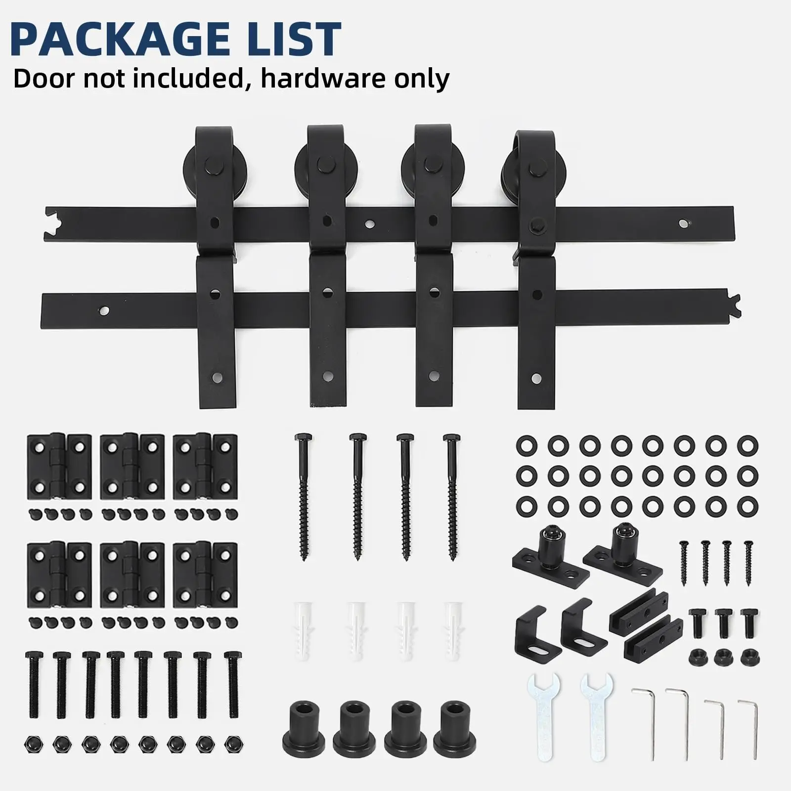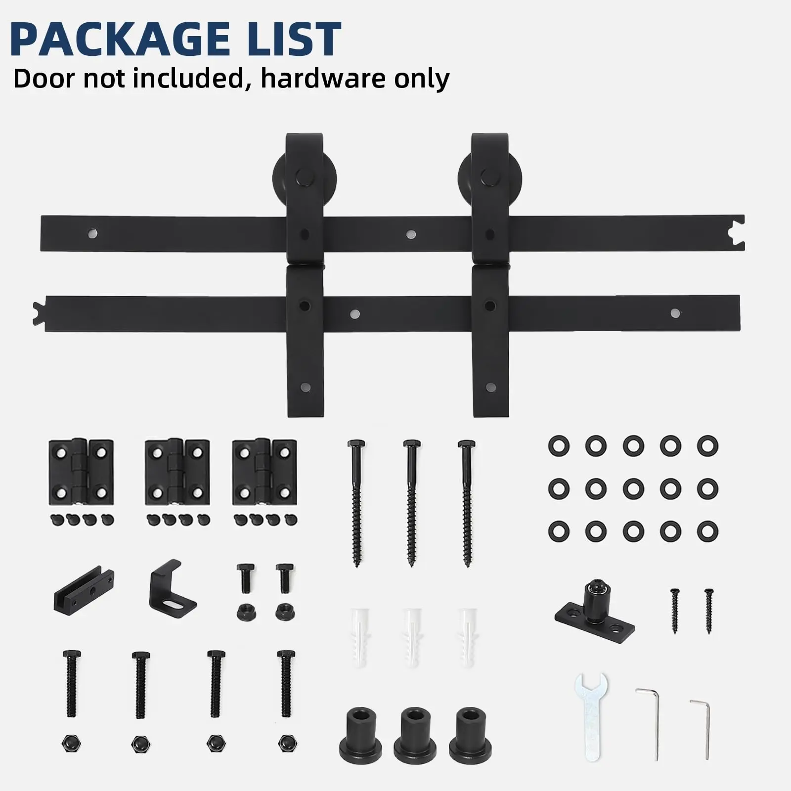 6. Complete Hardware Kit: Includes tracks (choose from 24in, 36in, 52in, 60in, or 72in), rollers, rotating brackets, spacers, hinges, floor guides, sealing strip, screws, and a clear illustrated assembly manual. Door panel not included.