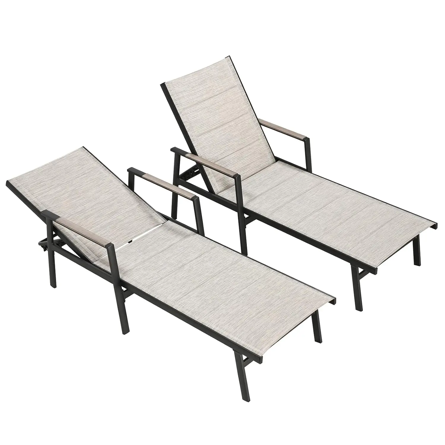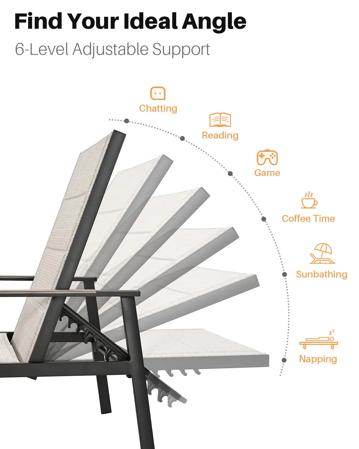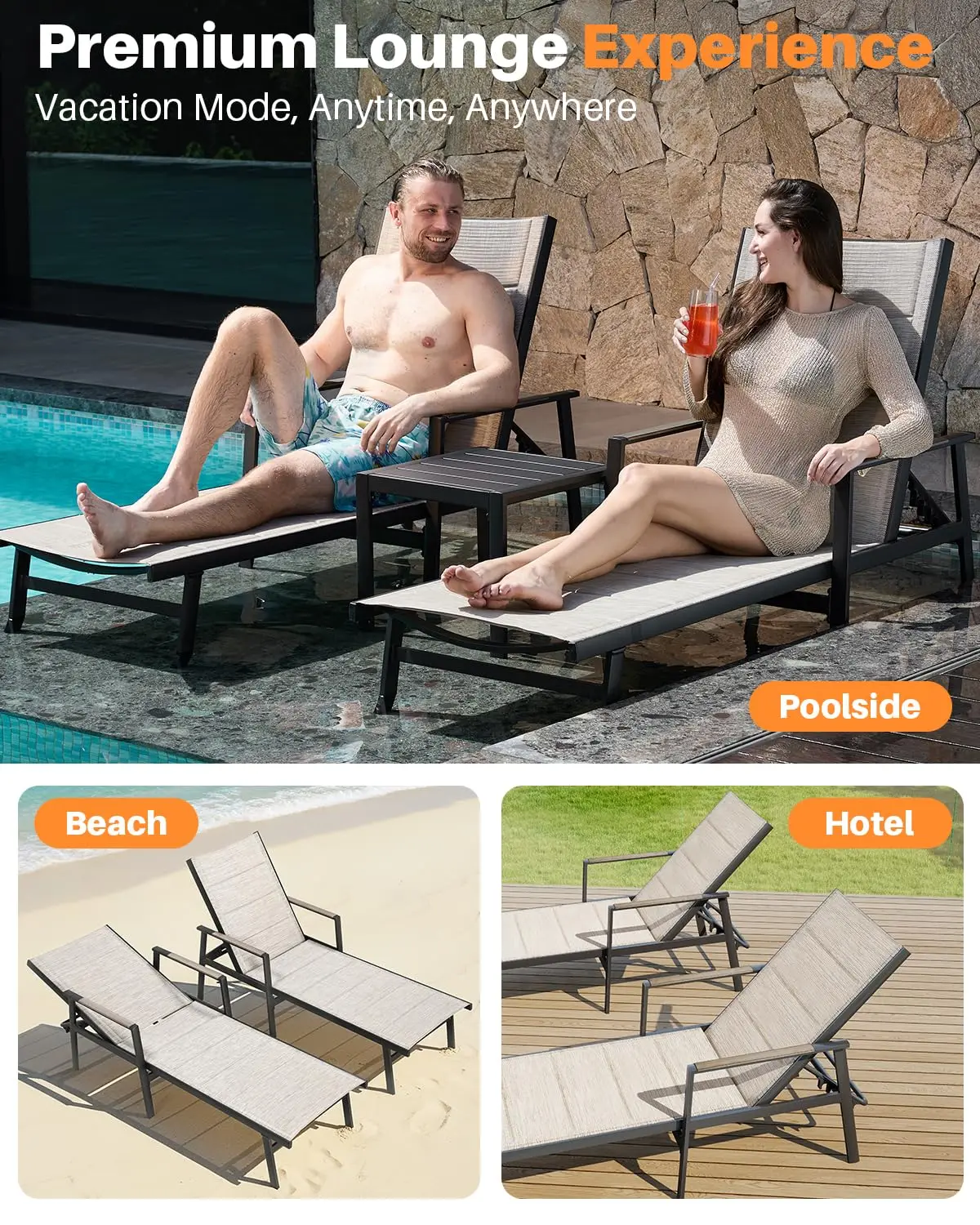 NEVER-RUST ALL-ALUMINUM STRUCTURE: Each chaise lounge is built with a premium aluminum frame that never rusts and resists corrosion, providing long-term stability and reliable support. The environmentally friendly powder-coated finish enhances durability and preserves a clean, polished look, giving both loungers a strong foundation for the textilene seating and dependable performance over time.
