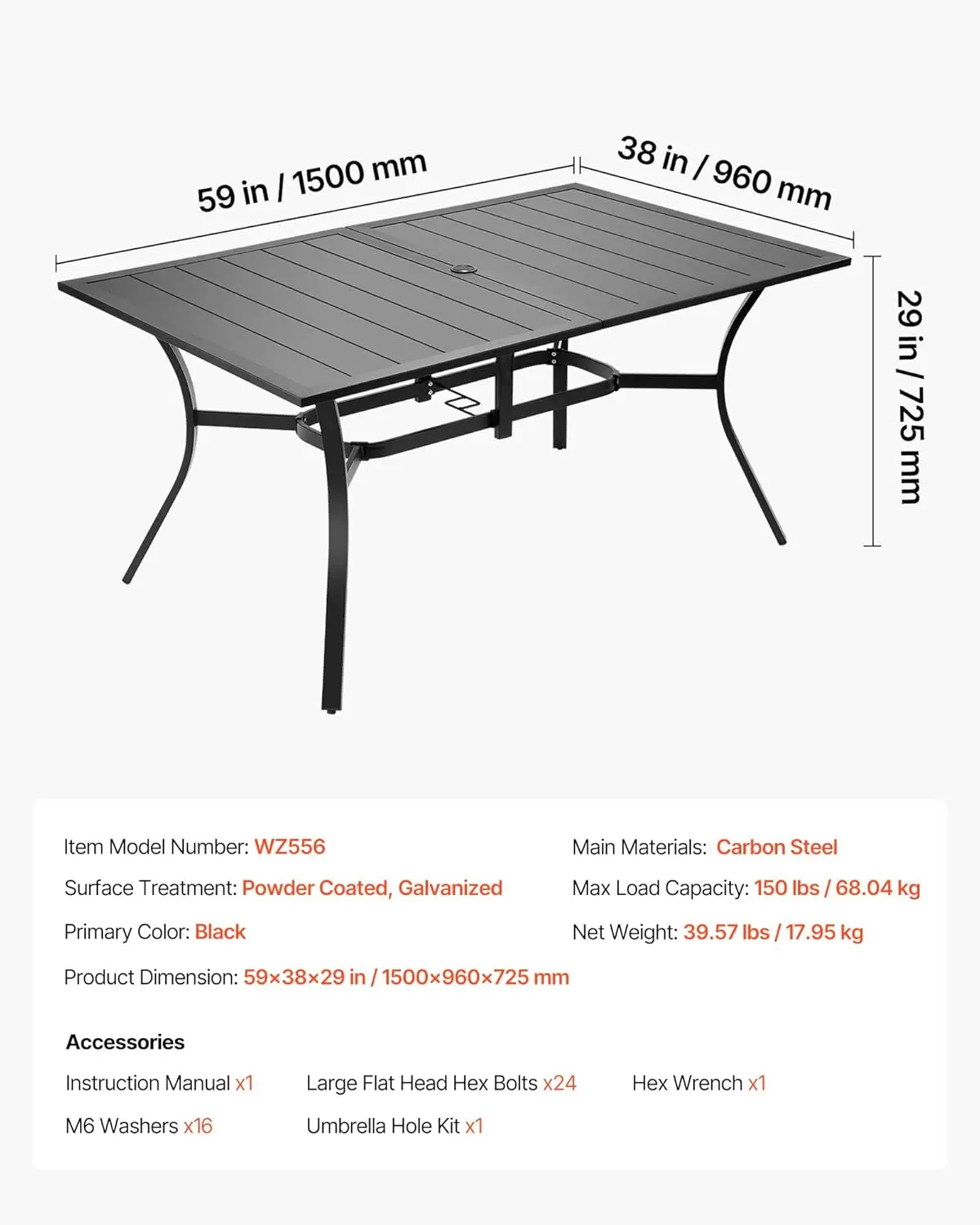 Seats 4–6 People: This patio dining table features a 59×38 in (1500×960 mm) tabletop, large enough for family meals or small gatherings. The table comes with easy-to-follow assembly instructions and all necessary hardware, making setup a breeze