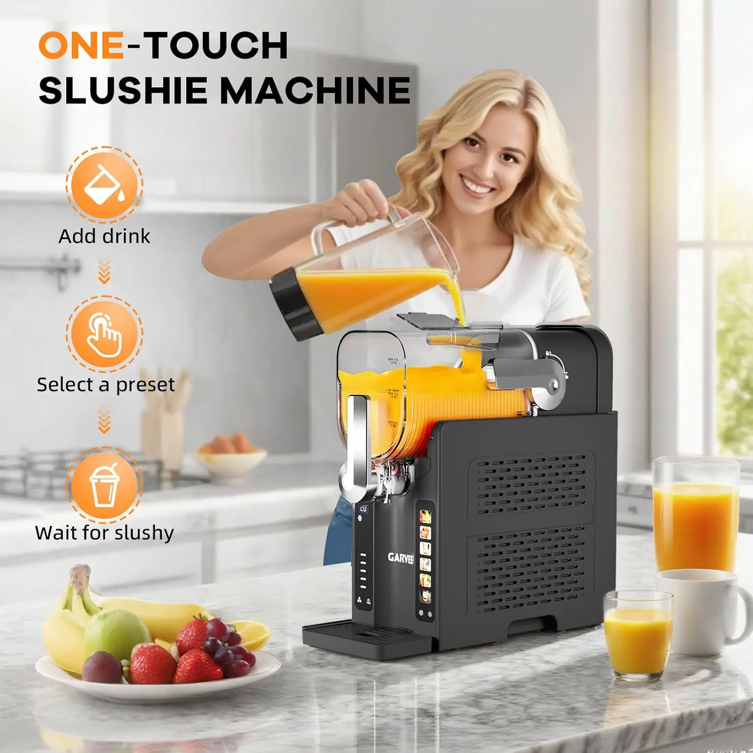 【No Ice Needed, Instant Slush】The home Slushie Machine skips ice prep and pre-chilling—thanks to a quiet high-performance compressor and flash-freezing tech, it turns juices, coffee, or wine into smooth slush in minutes. Usage Note: Mixture needs ≥4% sugar; alcoholic drinks require 2.8%-16% alcohol. Stir well before pouring—do not add ice, solids, or hot liquids. Perfect for quick treats or parties, it delivers restaurant-quality drinks at home.