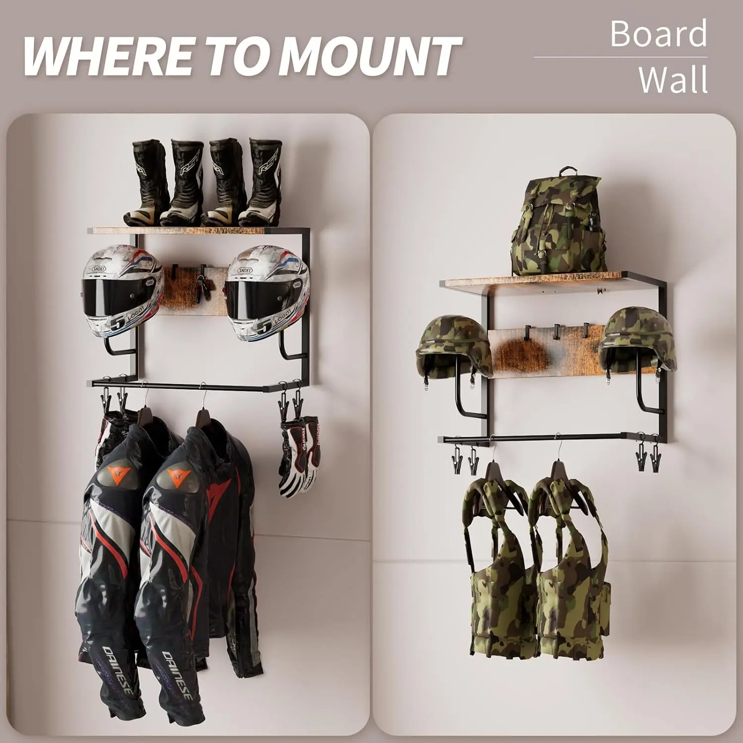 【Space-Saving Design】The compact and efficient design of this helmet rack maximizes storage space while minimizing the use of ground space, making it ideal for any entryway, garage, or storage room.