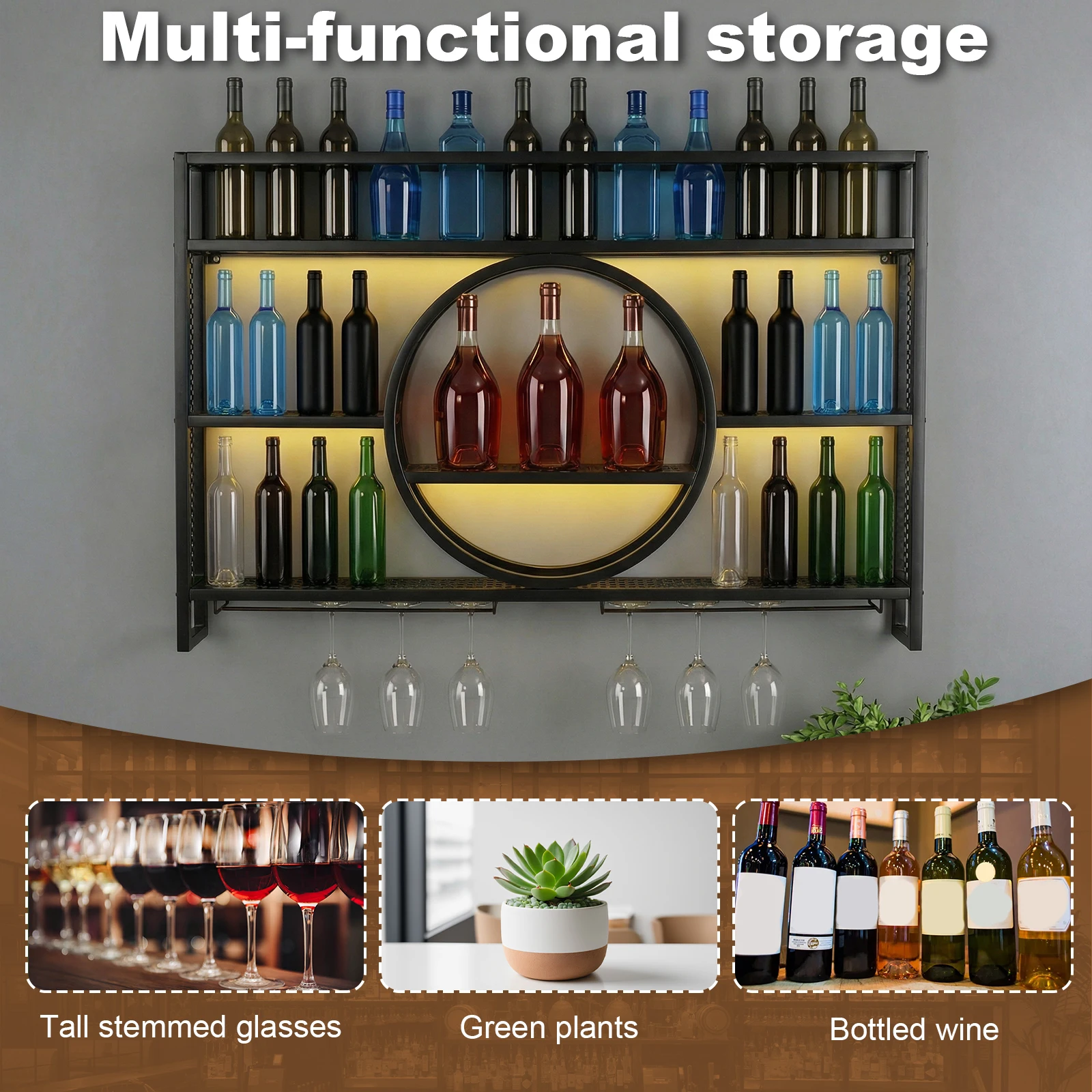 Large Capacity Modern Liquor Shelves Metal Wall Mounted Wine Rack 3 Tier with LED Light with Wine Glass Holder for Home Bar Dining Room Kitchen Living Room